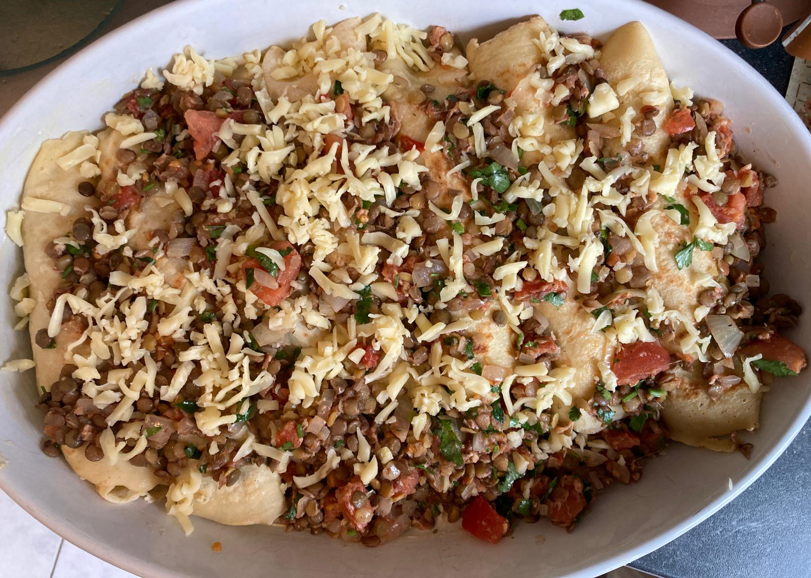 - Recouvrir chaque crêpe d’un peu de mélange aux lentilles, les rouler et les disposer côte à côte dans le plat, la jointure vers le bas. Saupoudrer le reste du fromage sur les rouleaux de crêpes.